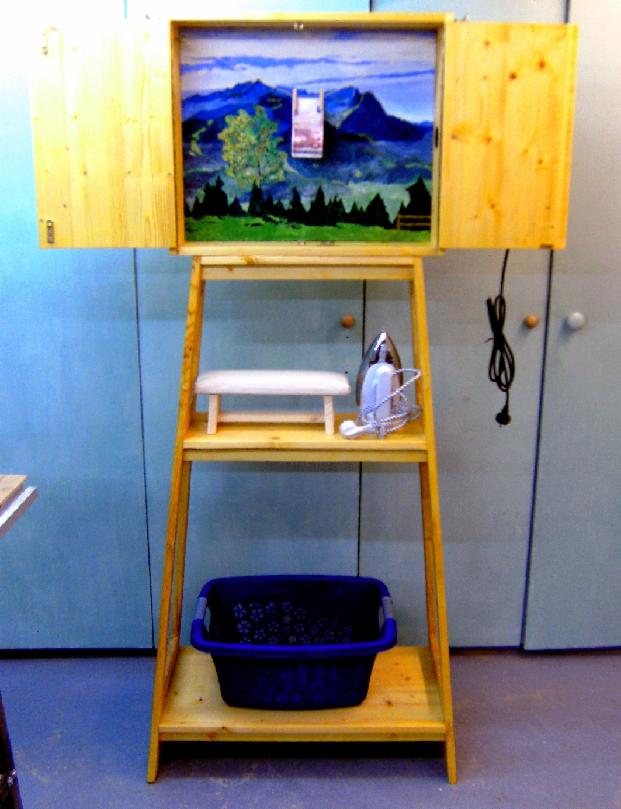 Geldrevitalisierungskasten, oder das Flattern eines zehn Euroscheines vor dem Zugspitzpanorama im Föhnwind; ein weiteres Objekt der Bildkastenserie. Masse: 60x50x15 cm plus Standregal 80x130x40cm. Entstehungsjahr: 2013