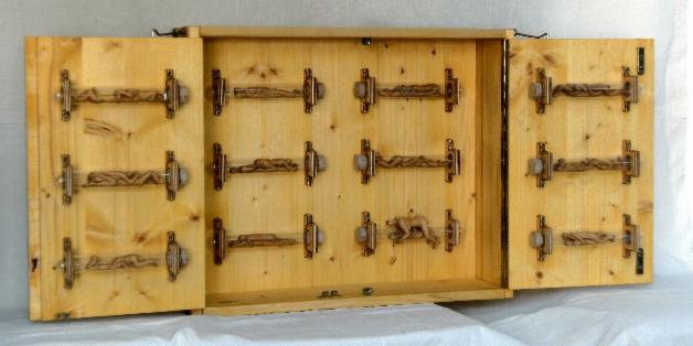 Holzkasten geschlossen 60x50x15cm aufgeklappt 120x50x17cm, Wandhängung, 12 Reagenzgläser mit