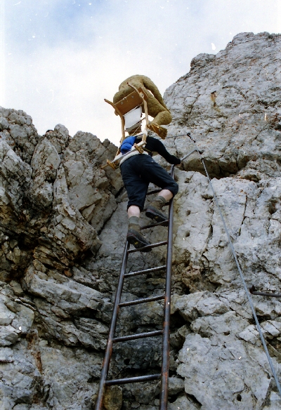 "Dem Dicken Mann das Dach von Deutschland zeigen" August 2002, Foto : Fabian Schwan , nach zweitägiger Wanderung, Start vom Garmischer - Skisprungstadion aus, Niepmann auf den letzten Höhenmetern zum Gipfelkreuz der Zugspitze. Kamera: Stephan Schwan und Tragehelfer des Begleitgepäckes : Sebastian Schwan.