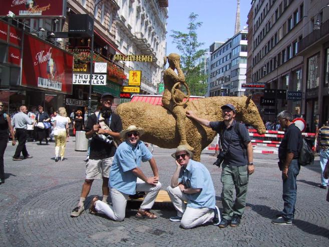 Stadtgang Wien July 2001 erster Tag , mit der Skulptur Reiterinstandbild I, Foto Johanna Bauer, von links; Werner Hertel Kamera, Martin Stiefel künstlerische Transportbegleitung , Friedo Niepmann Konzept und Skulptur , Gérard Cornioley Fotos
