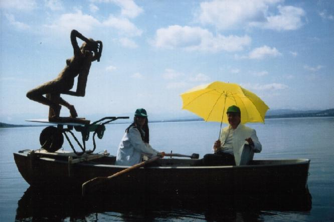 Erste Hohlkörper-Skulptur mit Flachsfaserbeschichtung, Akt auf Kreuz, "von Utting über den Ammersee hinauf nach Kloster Andechs", Foto Martina Henning 1998. Karin Moriz rudert Friedo Niepmann über den See. Das Skulpturen-Transportgestell besteht aus einer umgebauten Schubkarre.